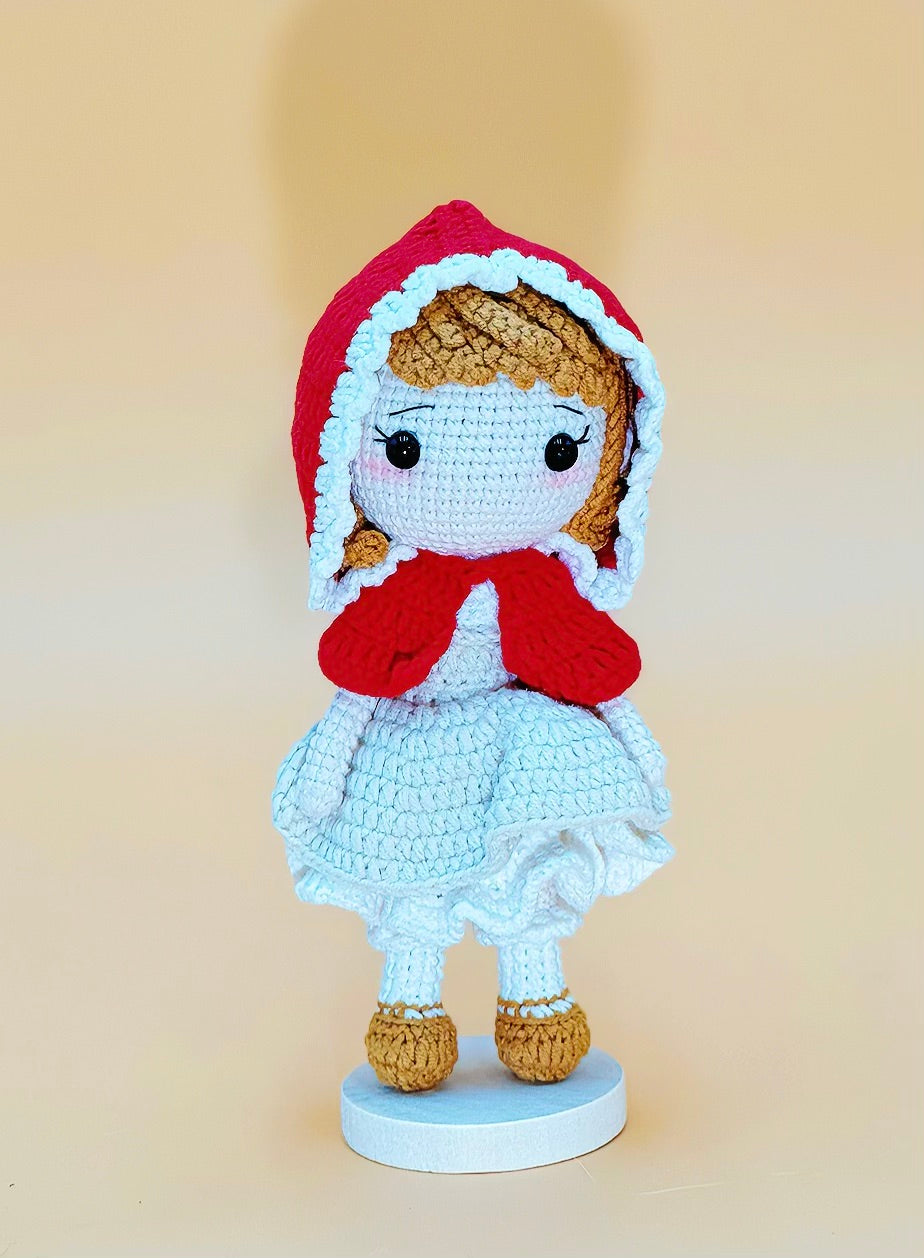 Little Red Riding Hood Figure: A charming crochet figure of Little Red Riding Hood, complete with her iconic red cape and basket. Handcrafted with delicate details and vibrant yarns, this figure beautifully captures the classic fairy tale character. Perfect for fans and collectors who cherish timeless stories and whimsical craftsman