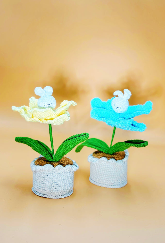 Introducing our charming Bunny Flower Crochet Pot! This delightful piece features bright, cheerful flowers intricately crocheted by hand, nestled in a soft, textured pot. The vibrant flowers bring a touch of sunshine to any space, making it perfect for brightening up your desk, windowsill, or as a thoughtful gift.