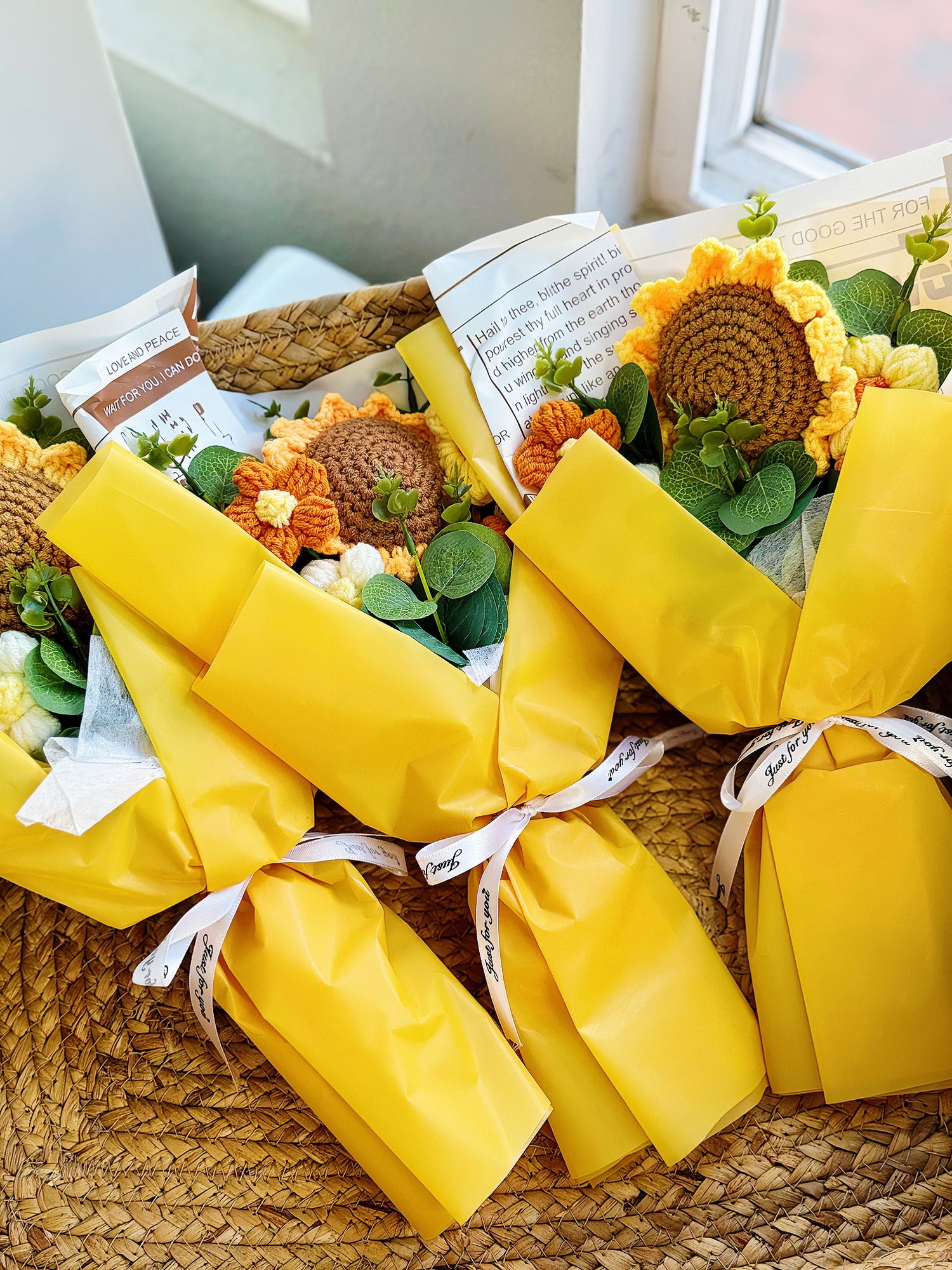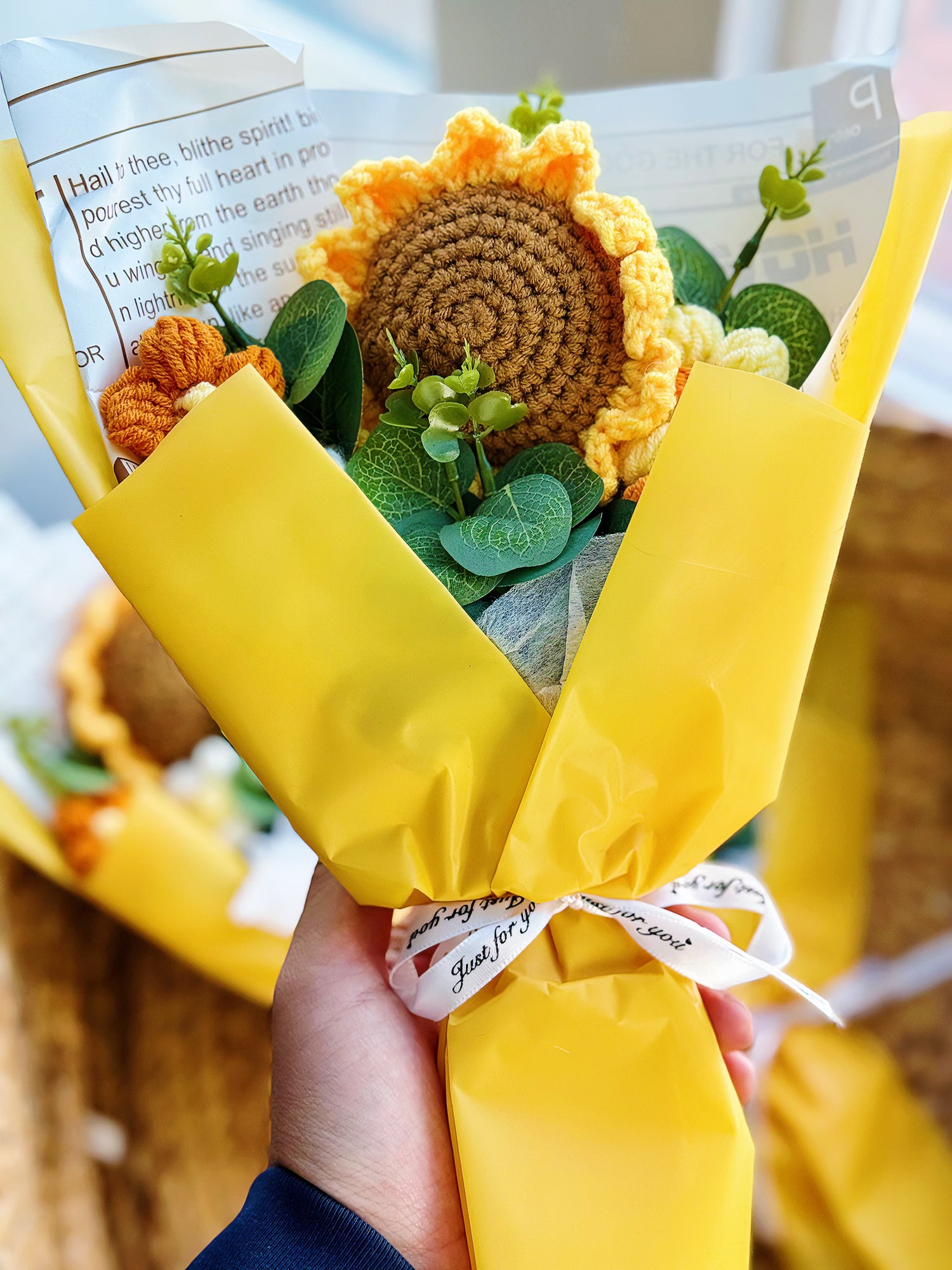 Brighten up any room with our Sunflower Crochet Bouquet, a delightful fusion of warmth and craftsmanship. Each bouquet features vibrant sunflowers meticulously handcrafted with care, showcasing intricate crochet work that captures the essence of these iconic blooms. Radiating with cheerful charm, these everlasting sunflowers bring a touch of joy and sunshine to any space they grace. Whether adorning your home or given as a thoughtful gift, our crochet bouquet is a beautiful way to spread happiness and brighten someone's day. Embrace the timeless beauty of sunflowers with our exquisite Sunflower Crochet Bouquet today.